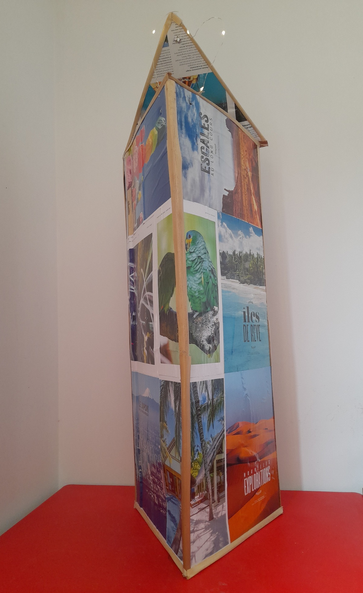 Matières utilisées : feuilles de vacoa, « tissu » coco, tige de bambou, verre poli par la mer, fil de fer, colles, vernis…